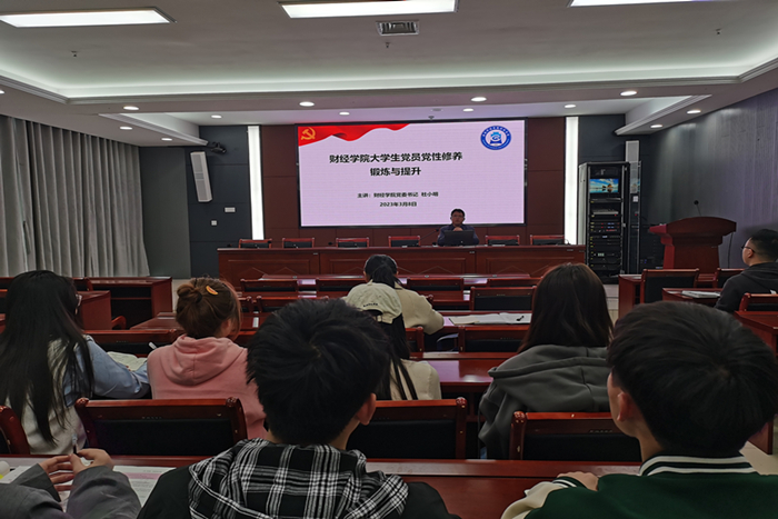 3月8日下午,财经学院在西副楼111召开学生党员专题教育会议,学院党委书记杜小明作了题为《大学生党员党性修养锻炼与提升》的辅导报告,全体辅导员、学生党员参加会议。