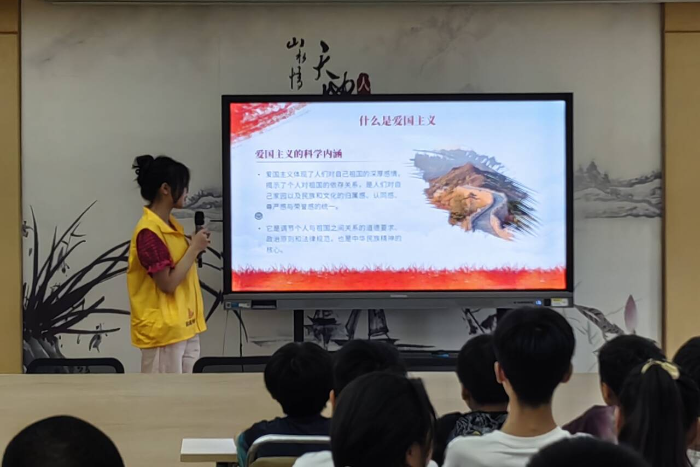 活动首先围绕“爱国主义宣讲教育”展开,设置ppt主题演讲、播放自制视频、提问交流相关问题三个环节。在轻松愉悦的氛围中,团队成员运用生动的语言与切实的数据,让孩子们更深刻的认识到爱国的重要意义。接着,团队成员为孩子们进行了相关的“心理健康教育”,通过我们精心设计的心理小游戏,孩子们的积极性得到显著调动,大家纷纷上台发言。