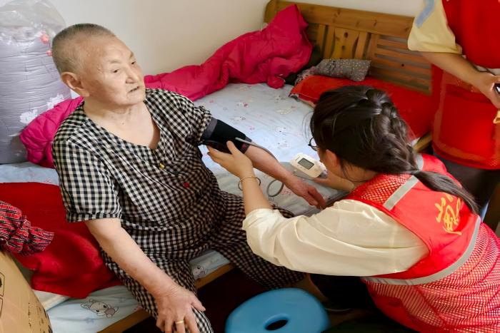 “奶奶,您坐好,袖子卷起来一点,我们测一下今天早上的血压,很快就好啦。”队员潘晨一边轻声安抚,一边熟练地将血压计袖带绑在老人手臂上。在社区活动中心的临时服务点,队员们两两一组,分别前往不同的小区居民楼,为独居的老人量血压、测心率。在测量前,为避免老人们情绪紧张,队员们也和老人们唠着家常,测量之后询问着老人最近的身体状况,家中子女是否常来看望。