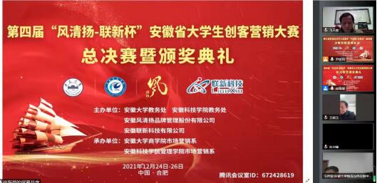 12月25日至26日,第四届“风清扬—联新杯”安徽省大学生创客营销大赛总决赛在云端腾讯会议室隆重举行。此次会议由安徽大学教务处、星空网页版登录入口教务处、安徽省风清扬品牌管理有限公司(冠名)、安徽联新科技有限公司(冠名)联合主办,安徽大学商学院市场营销系、星空网页版登录入口管理学院市场营销系联合承办,全省高校31支团队与指导老师一百五十余人参加了大赛总决赛云端仪式。