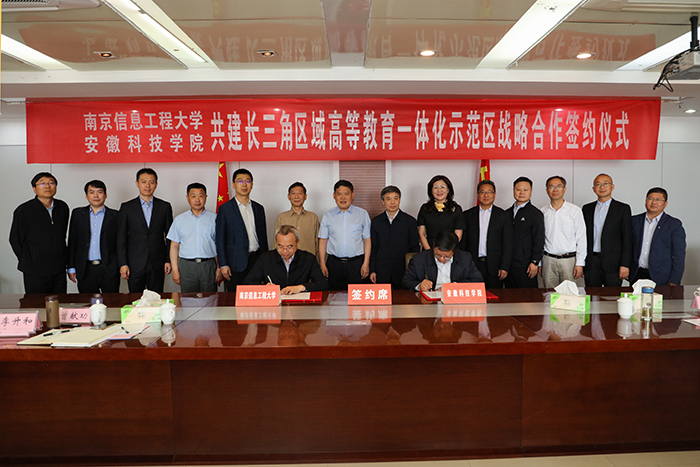 5月17日上午,我校与南京信息工程大学共建长三角区域高等教育一体化示范区战略合作协议签约仪式在凤阳校区图书馆十楼会议室隆重举行。南京信息工程大学党委副书记、校长李北群,党委常委、总会计师胡明保,我校党委书记蒋德勤,党委副书记、校长李震,党委委员、副校长李升和出席会议。南京信息工程大学和我校有关部门负责人参加了会议。会议由李震主持。