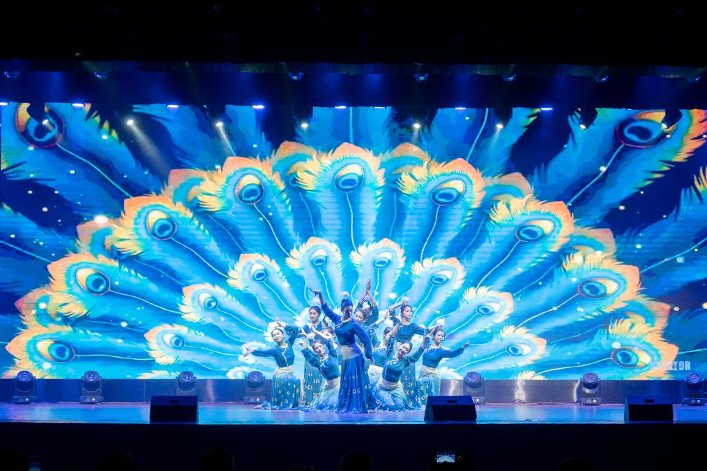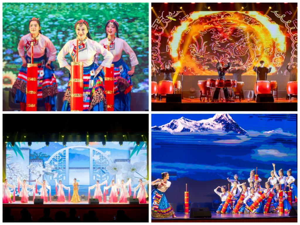 开场舞蹈《相和歌》遵循汉代宫廷舞蹈艺术风格,在舞蹈演员颔首低眉、舞之蹈之的诠释下,将古代女子娇羞又憧憬的爱情观展现在青年大学生眼前;随歌曲节目《国家》恢弘的音乐响起,同学们情不自禁的跟着哼唱起来:“家是最小国,国是千万家”、“我爱我的国,我爱我的家,我爱我国家。”平实的歌词道出了国与家的深厚情感,展现了国的强大与家的祥和;民乐重奏《茶马》,结合茶马古道的背景,通过扬琴、大阮、古筝、二胡等民族乐器的演奏,将大漠孤烟、古道文明的神秘与魅力淋漓尽致地给展现出来,让人感受茶马古道沿途的秀丽风光和浓厚的人文情怀;原创反诈戏剧《红线》戏剧聚焦校园安全意识等问题,警示大家抵制诱惑,不要让身边的红线转为吞噬青春的陷阱;民族舞《酥油飘香》通过描绘一群为解放军打酥油茶和送油茶的藏族姑娘,讴歌了青藏高原上军民鱼水情,更展现了新世纪藏族女性的新风貌。润物细无声中引导台下师生铸牢中华民族共同体意识;打击乐《龙腾虎跃》,通过富有激情的演奏,渲染了气势壮阔的欢腾场面,曲子情绪炽热,民族风格浓厚;歌曲《我的深情为你守候》缓缓诉说峥嵘岁月和儿女热血的赤子之情,饱含深情并且充满着时代气息。