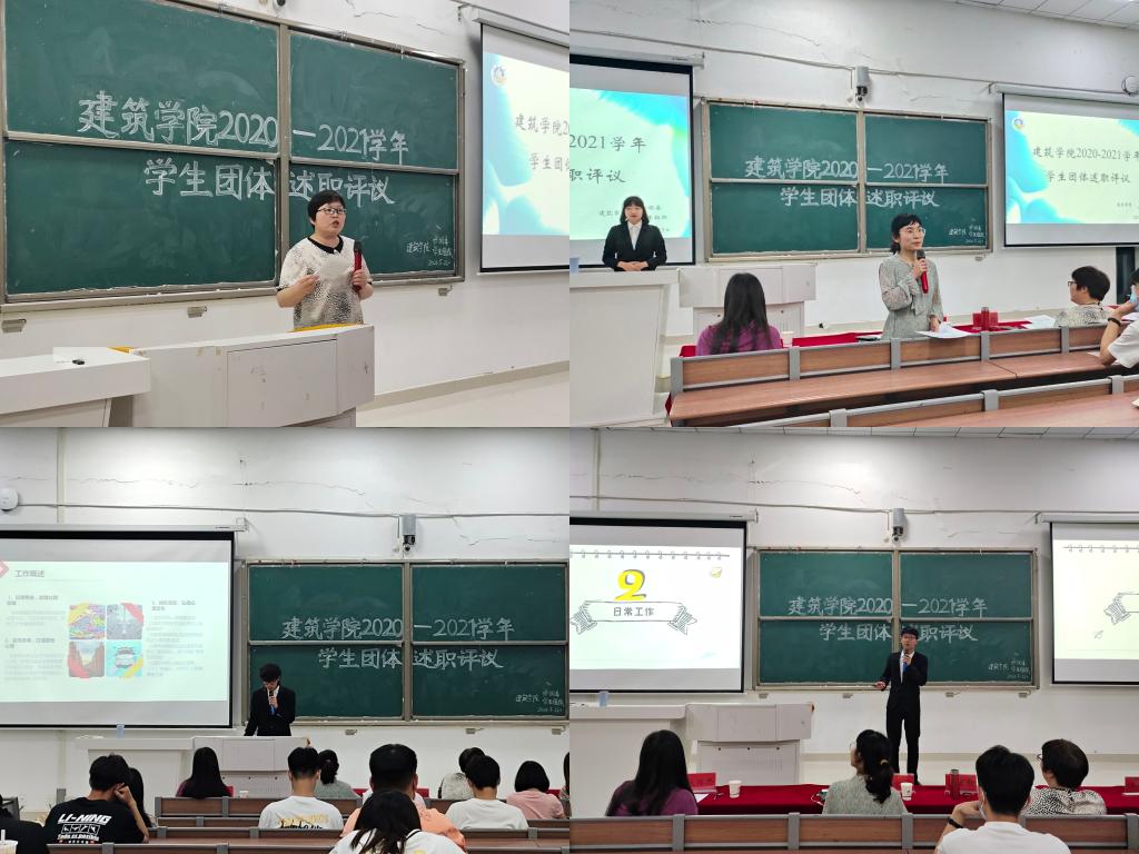 为不断加强建筑学院学生组织建设,深化落实学生组织体制改革。5月23日晚,建筑学院于致知楼C111开展建筑学院2020-2021学年学生团体述职评议。建筑学院党委副书记谢宜勤、建筑学院团委书记沈德艳、建筑学院专职辅导员阮怀思、建筑学院第五届学生会主席王海燕担任本次述职评议评委,建筑学院学生组织全体成员参加此次学生团体述职评议。