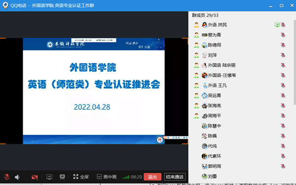 为进一步做好英语(师范类)专业认证工作,4月28日晚,外国语学院通过QQ群在线上召开英语(师范类)专业认证工作推进会,学院党政领导及参与认证工作的全体教师出席会议,会议由院长陈德用主持。