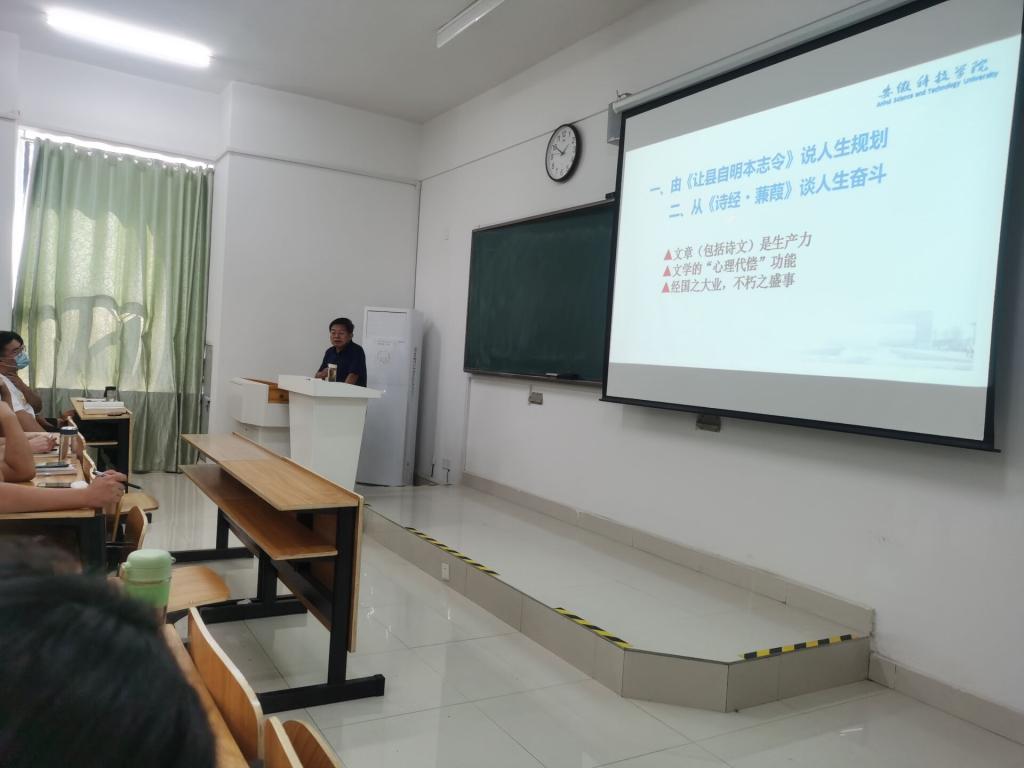 陈传万以《从经典文学谈成长成才》为题,引曹操《让县自明本志令》谈人生规划,借《诗经 蒹葭》启人生奋斗,涌泉汩汩,意蕴至深。