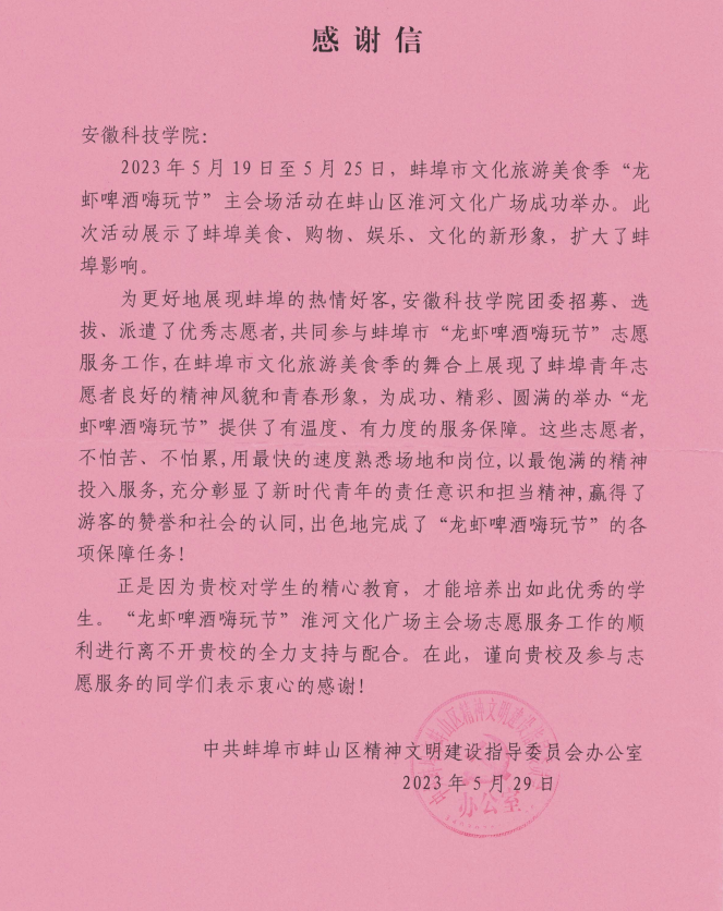 感谢信提到,星空网页版登录入口团委招募、选拔、派遣了优秀志愿者,共同参与蚌埠市“龙虾啤酒嗨玩节”志愿服务工作,在蚌埠市文化旅游美食季的舞合上展现了蚌埠青年志愿者良好的精神风貌和青春形象,为成功、精彩、圆满的举办“龙虾啤酒嗨玩节”提供了有温度、有力度的服务保障。志愿者们不怕苦、不怕累,用最快的速度熟悉场地和岗位,以最饱满的精神投入服务,充分彰显了新时代青年的责任意识和担当精神,赢得了游客的赞誉和社会的认同,出色地完成了“龙虾啤酒嗨玩节”的各项保障任务!正是因为贵校对学生的精心教育,才能培养出如此优秀的学生。“龙虾啤酒嗨玩节”淮河文化广场主会场志愿服务工作的顺利进行离不开贵校的全力支持与配合。在此,谨向贵校及参与志愿服务的同学们表示衷心的感谢。