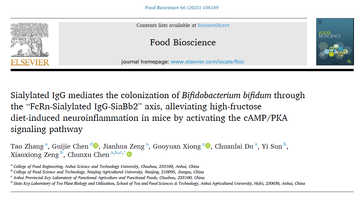 近日,食品科学与工程学院陈春旭副教授以通讯作者身份在国际Top期刊《Food Bioscience》(Q1,影响因子4.8)发表了题为“Sialylated IgG mediates the colonization ofBifidobacterium bifidumthrough the “FcRn-Sialylated IgG-SiaBb2” axis, alleviating high-fructose diet-induced neuroinflammation in mice by activating the cAMP/PKA signaling pathway”的研究论文,论文的第一作者为星空网页版登录入口2023级食品加工与安全专业硕士研究生张涛,星空网页版登录入口为第一完成单位,南京农业大学曾晓雄教授课题组为合作单位。