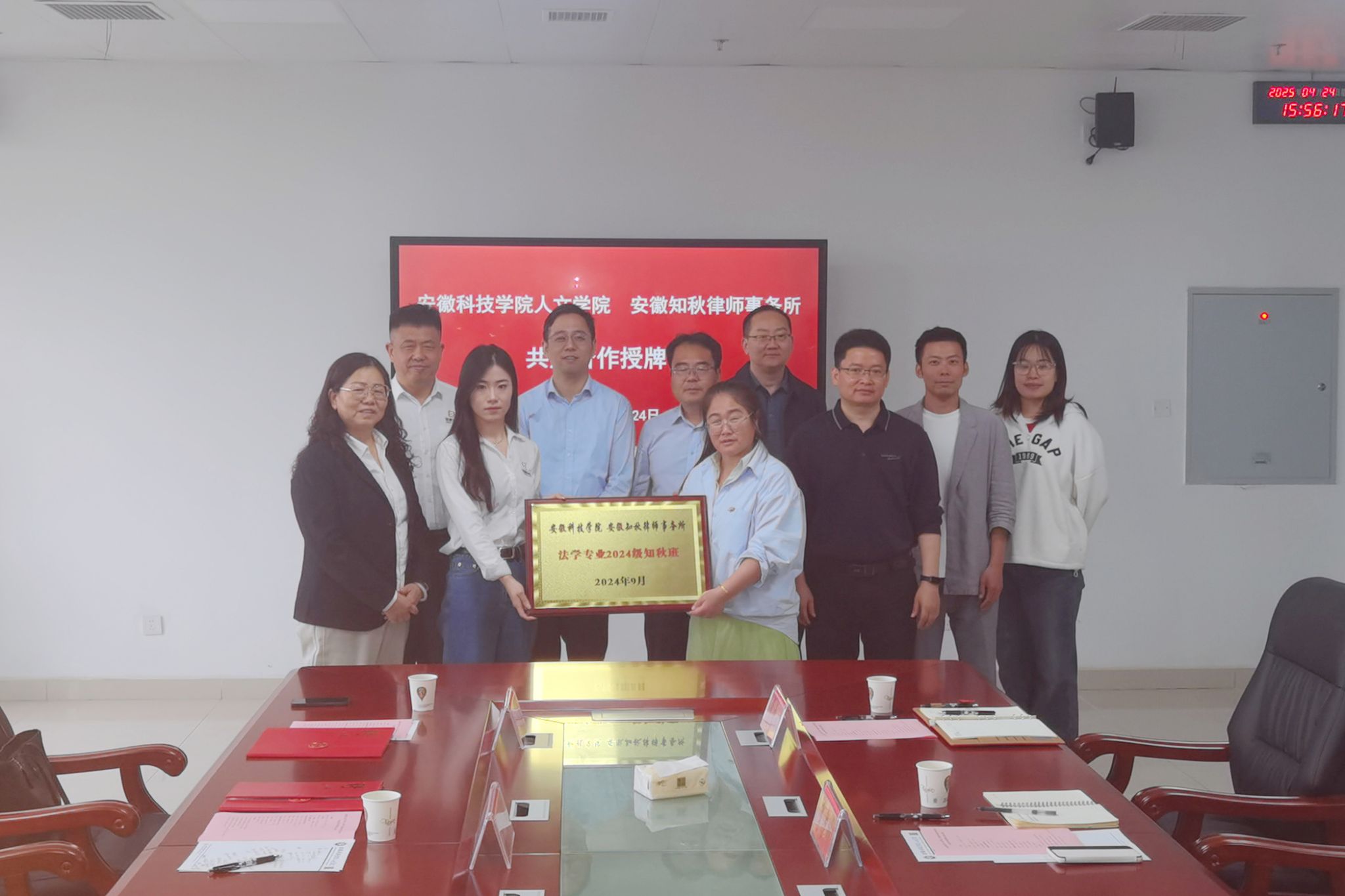 4月24日下午,人文学院与安徽知秋律师事务所在学院313会议室举行共建合作授牌仪式。安徽知秋律师事务所主任、首席合伙人宫鉴一行4人,人文学院党政领导班子成员和教师代表出席。仪式由人文学院副院长牛永辉主持。