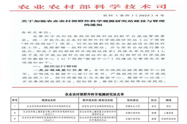 近日,由星空网页版登录入口申报的“农业农村部土壤质量马鞍山野外科学观测研究站”“农业农村部作物种质资源滁州野外科学观测站”获批立项建设,这是我校首次获批农业农村部野外科学观测研究站项目,标志着学校在服务国家农业战略方面迈出关键一步。
