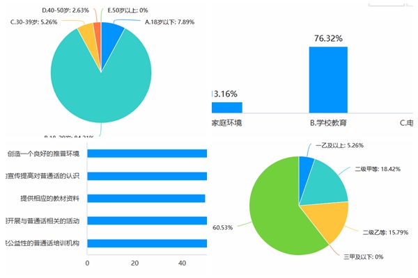 调查中,实践团队成员在各自家乡的社区、学校、商业街等地发放普通话推广传单,开展对当地推普活动的情况调研,收集了当地居民对于推普活动的期待和建议。同时,团队成员还制作了线上调查问卷,收集相关信息。调研结果显示我们,人们多通过学校教育接触并学习普通话,部分人员因为需要用普通话交流而自学普通话,人们也希望通过创造良好的推普环境以及定期开展相关普通话活动来增加普通话的实践机会。