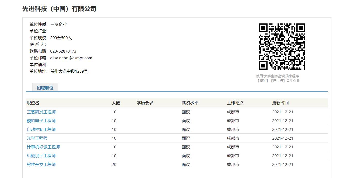 ASM Pacific Technology Ltd.(ASM太平洋科技有限公司,简称ASMPT)是全球领先的半导体装配及封装设备、材料及表面贴装技术供应商。ASMPT总部设在新加坡,同时在新加坡、中国香港、中国成都、德国慕尼黑、英国、荷兰、中国台湾等11地拥有研发基地,在中国深圳及惠州、新加坡、马来西亚和德国慕尼黑等12地拥有生产基地,业务分布全球30多个国家,目前全球员工超过16000人。ASMPT于1989年在香港上市(0522.hk) 。作为行业的领军者,从2002年至今,ASM集团销售业绩稳居全球第一。 先进科技(中国)有限公司(即ASM 成都研发中心,简称ATC),成立于2008年6月,总投资额5000万美元。ASMPT投资自主修建有独立的半导体生产设备研发大楼,占地面积16,666平米,建筑面积4万平米。内设大量光、机、电等相关实验室,配备完善的仪器设备设施。