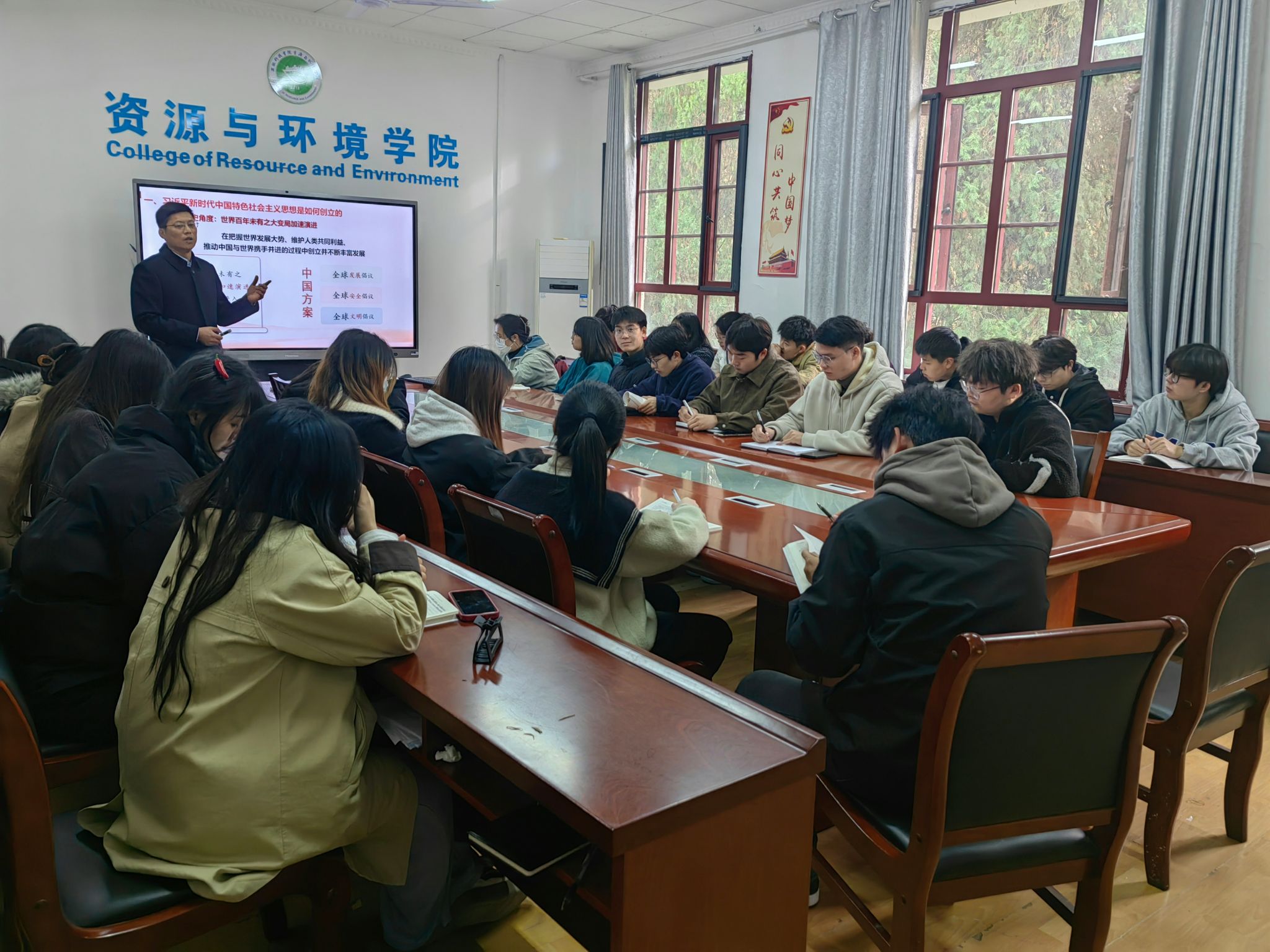 为教育引导学生深入学习马克思主义中国化时代化历史性飞跃及最新成果,11月24日下午,资源与环境学院于学院会议室召开了以“马克思主义中国化时代化新的飞跃”为主题的党课学习。非毕业生党员和入党积极分子参与听取本次专题党课,专题党课由学院党委书记沈树周主持。