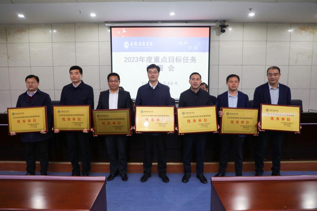 会上,蒋德勤、李震代表学校与二级单位(部门)主要负责人签署了《2023年度工作目标任务书》。 黄远友公布了2022年度单位(部门)目标管理考核结果。蒋德勤、李震、黄远友分别为目标管理考核优秀单位和单项奖单位颁发了奖牌。目标管理考核优秀单位代表,建筑学院院长张远兵同志、电气与电子工程学院院长夏显明同志、党委组织部部长钱锐同志、党委(校长、法治)办公室主任曾献功同志分别作了典型经验交流发言。(特约通讯员:张欣  摄影:陈宝 编辑:张欣 审核:程斌)