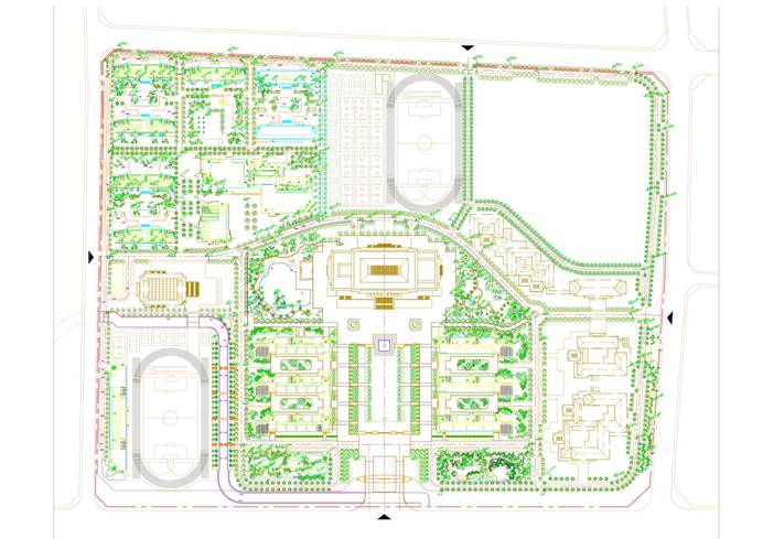 位于学校景观中央的景观主轴是学校的中心位置和景观的核心。设计上采用常绿的香樟作为骨干树种布置于绿地两侧。中心草坪两侧边缘种植樱花。