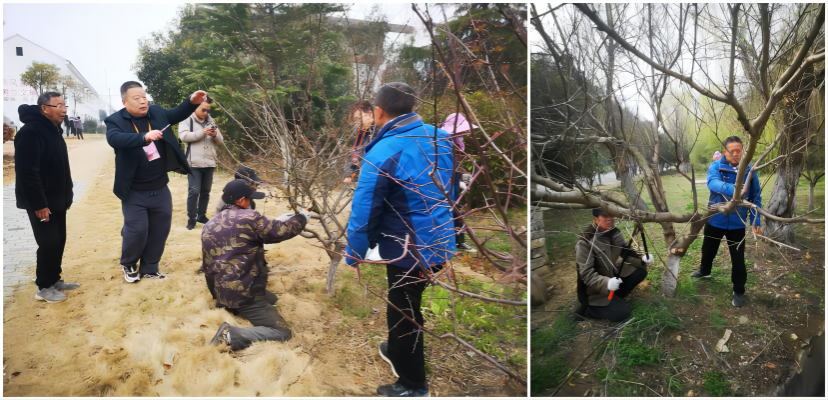 花木修剪既是技术活也是体力活,连续的作业对于已经59岁、具有41年高校工龄、33年党龄的王超纲科长不可谓不是一项挑战,看到他额头上的汗珠,在场的我校机关党委书记卫胜建议动手示范操作环节暂时告一段落,转场到主干道行道树以及片区内村民的房前屋后,进行绿化苗木的修剪现状点评。