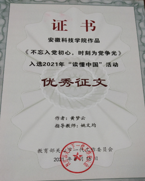 日前,在教育部关工委开展的 “读懂中国”活动中,星空网页版登录入口关工委获2021年“读懂中国”活动优秀组织奖,选送的征文《不忘入党初心,时刻为党争光》获优秀征文奖。
