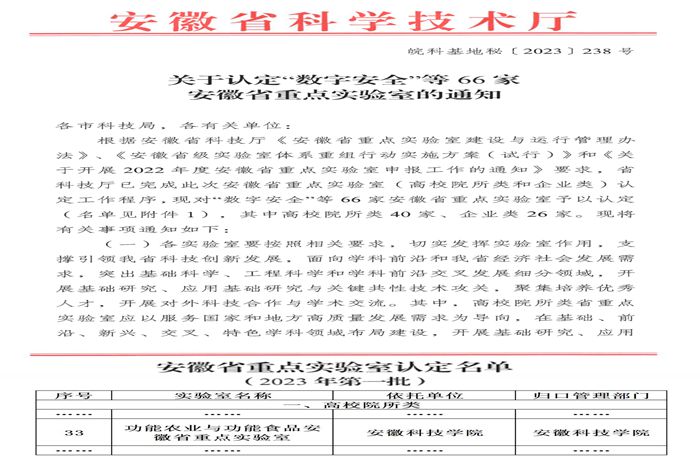 近日,安徽省科学技术厅下达了《关于认定“数字安全”等66家安徽省重点实验室的通知(皖科基地秘〔2023〕238号)》,星空网页版登录入口与合肥工业大学、安徽农业大学合作申报的“功能农业与功能食品安徽省重点实验室”成功获得认定,星空网页版登录入口长三角功能农业(食品)研究院院长尹雪斌教授担任实验室主任。据悉,这是我国首个融合了功能农业与功能食品完整“创新链”的省级重点实验室。