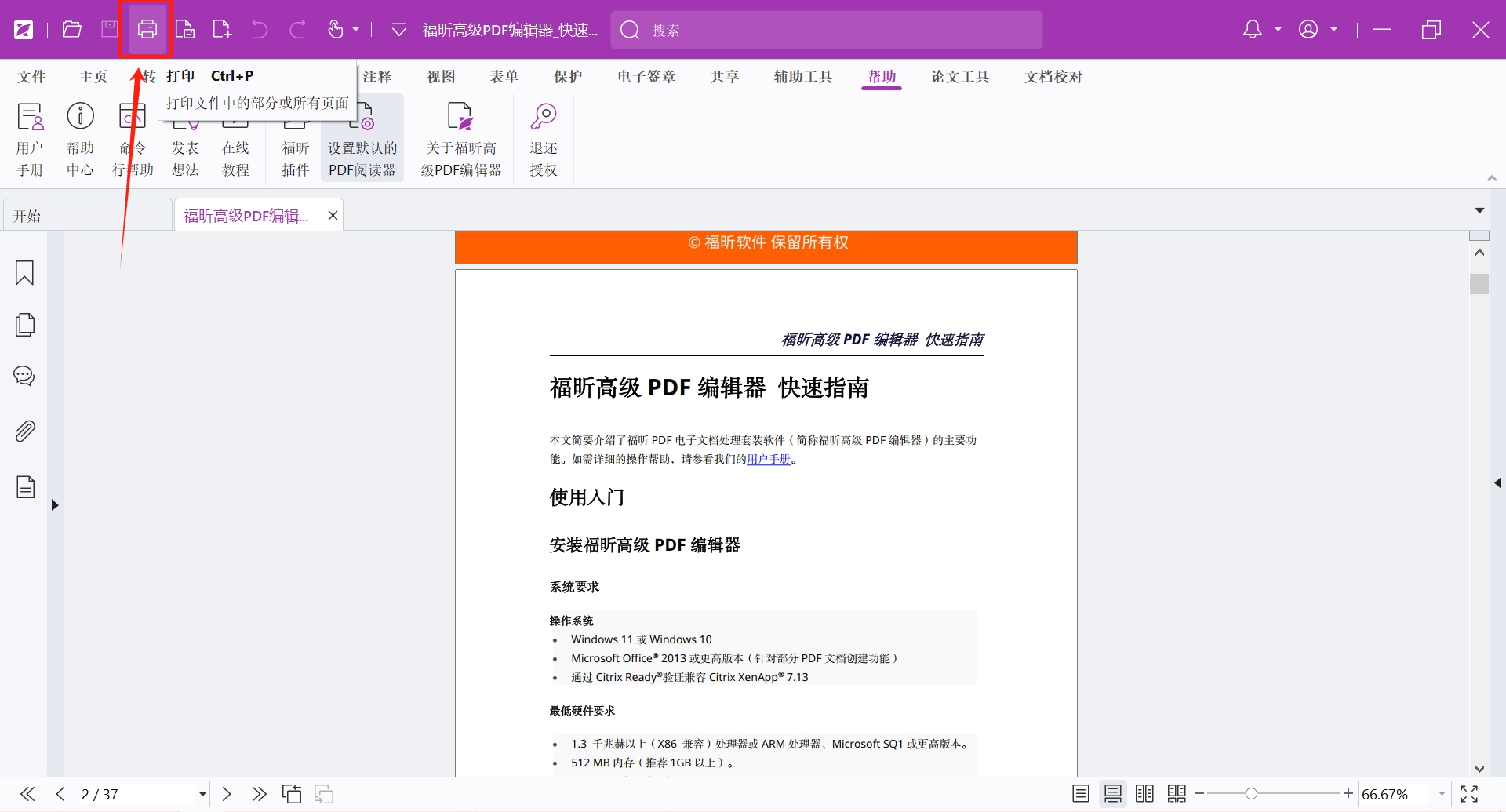 我们利用福昕高级PDF编辑器打开一份需要打印的文档,点击顶部打印按钮,或者使用快捷键Ctrl+P,打开打印对话框: