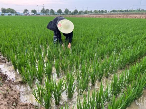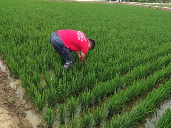 在小岗种业水稻基地,基地里的水稻正处于营养生长分蘖期,实时动态掌握水稻分蘖情况是了解水稻长势、合理布置水肥的重要条件,从而促进成穗率的提高,提高水稻产量。小队成员在小岗种业副总傅先来的带领下穿上水鞋、带上草帽,走下田埂协助查苗、记录实时水稻分蘖情况。今年进入梅雨季节后,基地已通过开展严控田间水位、增施特种肥料、开展病虫害防治等工作保障水稻营养生长。