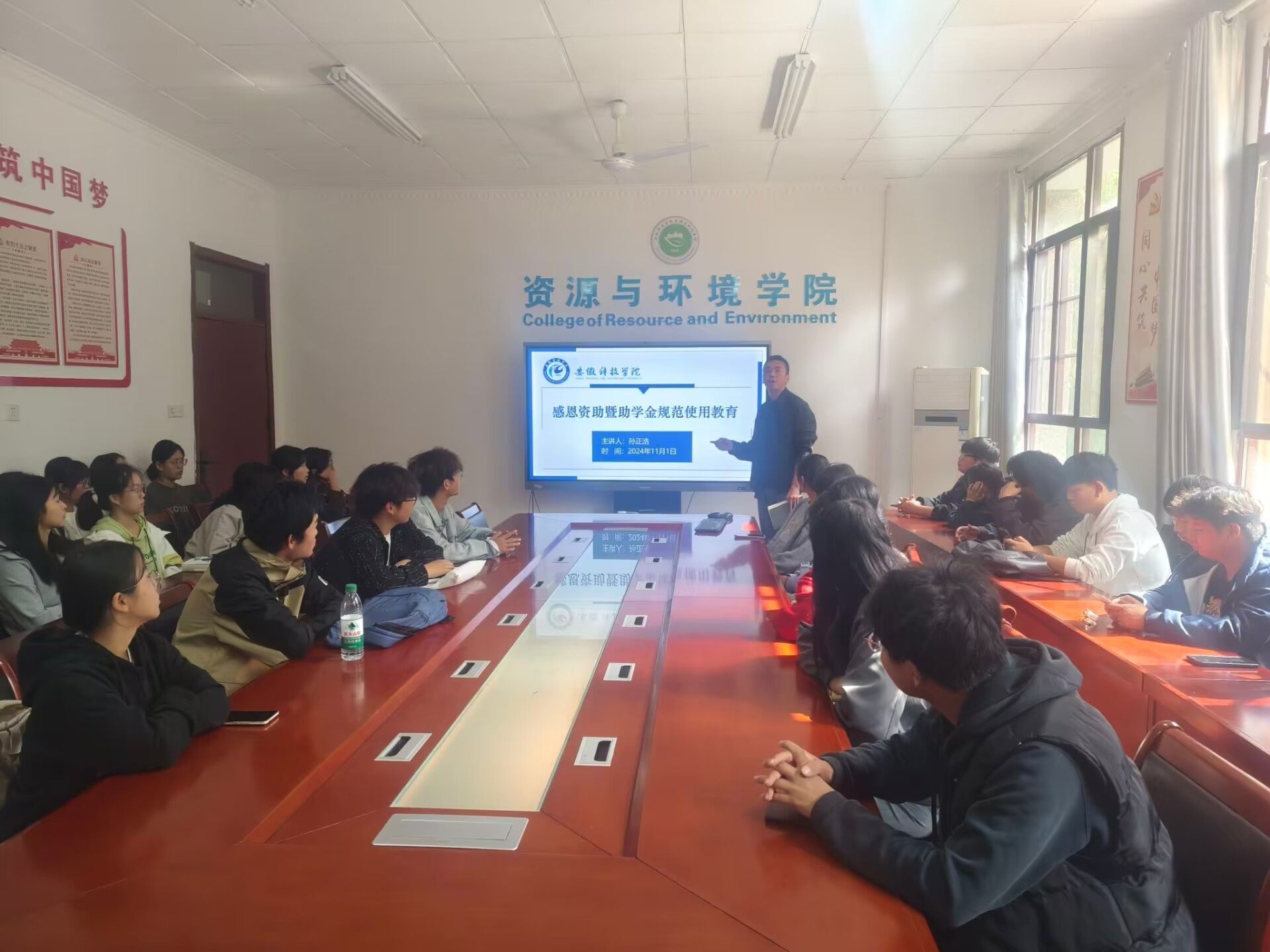 为了切实做好我院学生对于各类奖学金、助学金的规范使用工作,引导学生牢固树立感恩意识。11月1日中午,资源与环境学院于学院会议室召开感恩资助暨奖助学金规范使用教育会议。辅导员孙正浩及24级获得国家助学金的同学参加会议。
